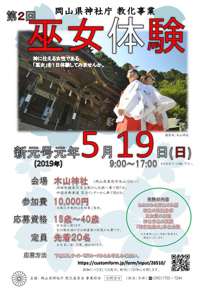 岡山県神社庁主催で、5月19日(日)に木山神社で「巫女体験」が行われます。 普段はなかなか得られない知識、なかなか出来ない経験、なかなか触れられないものにも触れることができます。 ぜひ、ご参加下さい!