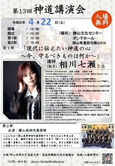 令和5年4月22日(土)に岡山県真庭市勝山319(勝山文化センター)にて、岡山県神社庁真庭支部・真庭神職総代連合協議会主催の「第13回神道講演会」が行われます。講演会は2部構成になっております。